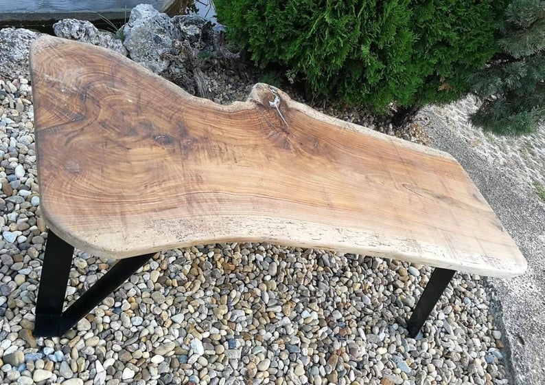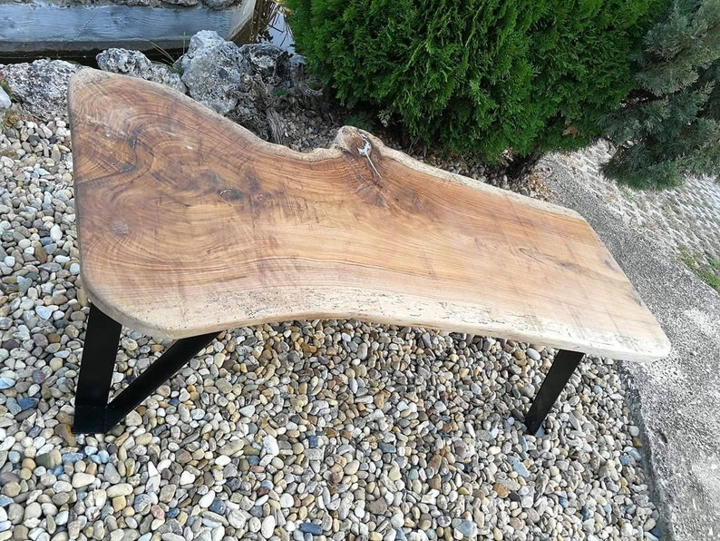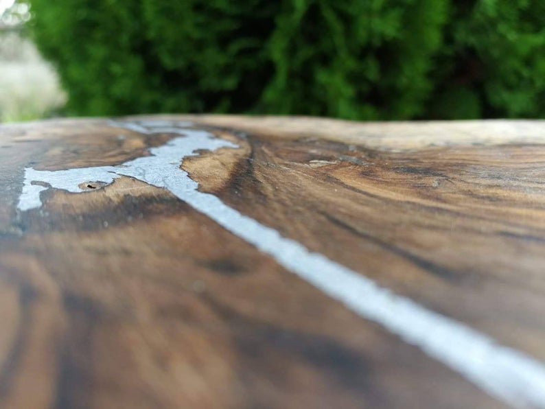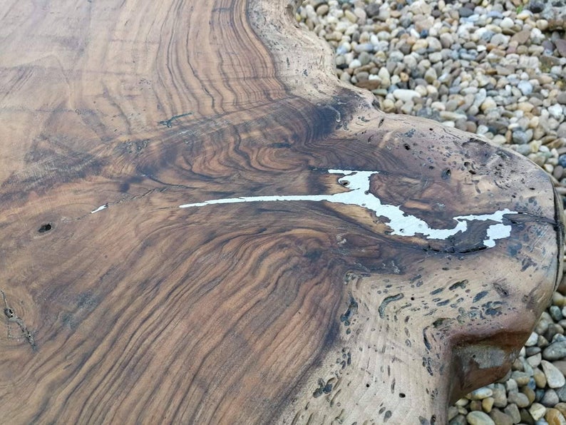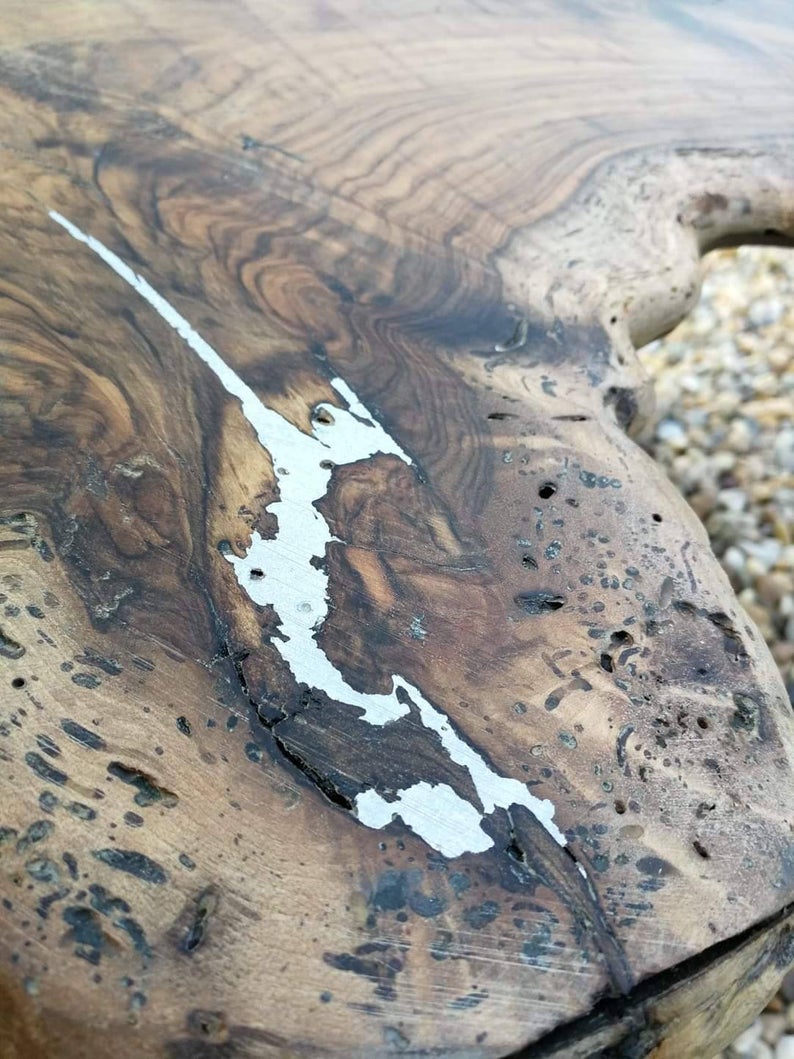 Handcrafted wooden table made from massive walnut with metal inlaid.
