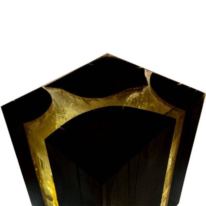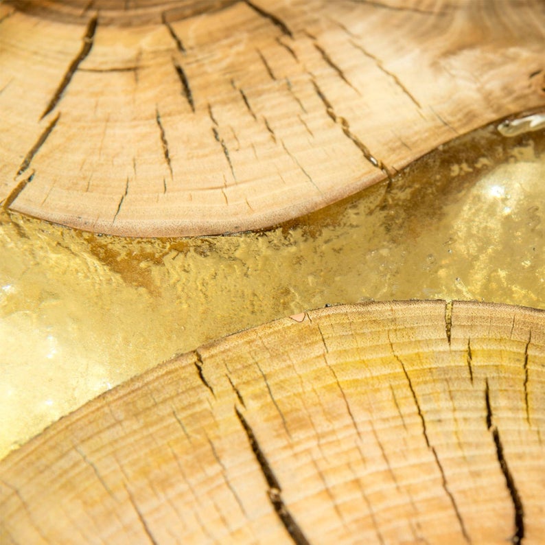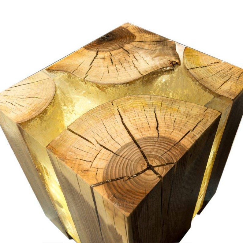 ►The wood is left with its natural colors to further the contrasting statement between the two materials which are in perfect geometric synchronicity. The resin is clear yet shattered and refilled couple of times to add a luminance and avoid the clear and glass-like look because that adds richness to the deep parts. As if we be solidified a cloud between the nature, and cut for you a cubical little part just to give a part of life frozen in time for your interior.
